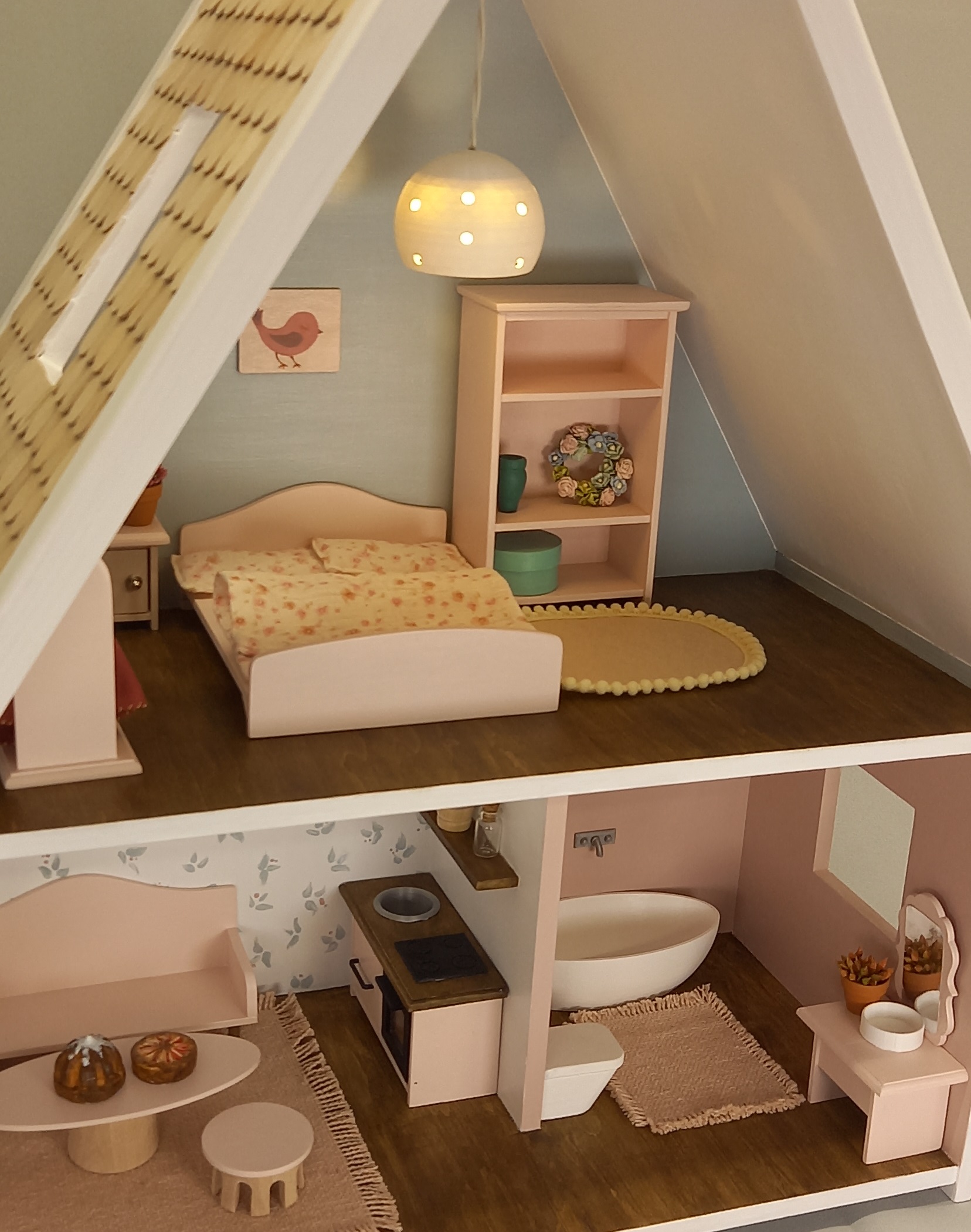 Az első babaházat 2020-ban készítettük kislányunknak. Ekkor fogalmazódott meg bennünk egy vállalkozás ötlete, melyet hivatalosan 2023 nyarán indítottunk el. Saját tervezésű, főként fából készült játék bútorokat, babaházakat készítünk két méretarányban. 1:12 méretarány a 10-14cmes babákhoz; 1:6 méretarány max 30cm-es babákhoz. Minden darab kézzel készül kellemes pasztell színekkel fűszerezve mégis modern köntösben. A bútorok mellett apró kiegészítőkkel, textil takarókkal, párnákkal, egy mai modern szoba, ház kicsinyített mását lehet tetszés szerint összeállítani. Nem csupán esztétikai értékkel bírnak, de funkcionálisan is kielégítik a 2-3 év feletti korosztály igényeit, akik már szívesen használják a kis ajtókat, fiókokat, rejtenek el benne kincseket. Ízléses, minőségi játék, mellyel a gyerekek időben elkezdik értékelni a kézműves termékek által nyújtott élményeket. A fából készült játékok sokkal időtállóbbak. A babázás pedig egyszerre szórakoztató és készségfejlesztő!