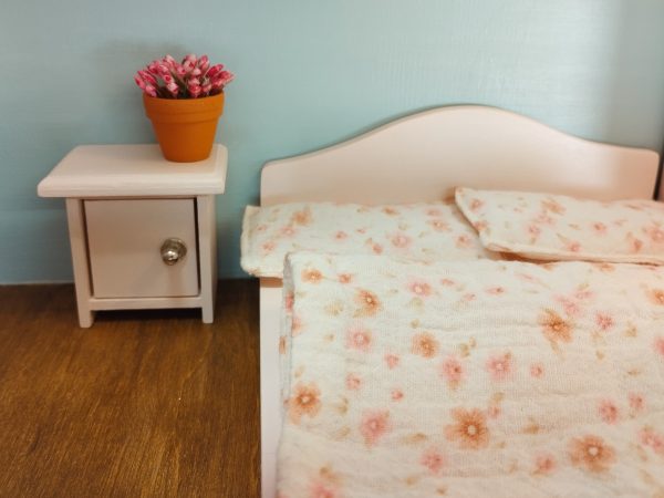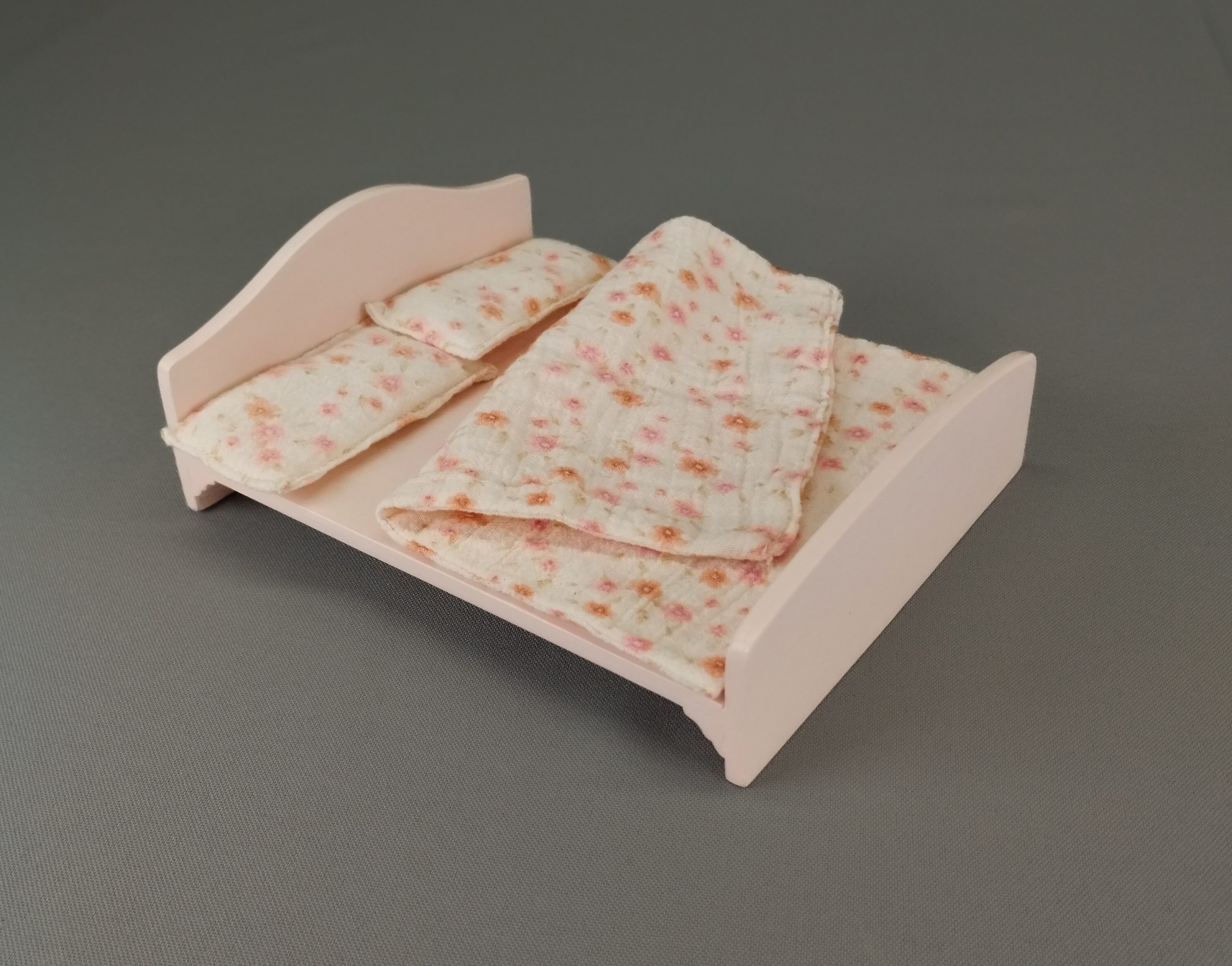Fából készült franciaágy két baba számára. Íves vonalvezetésű ágytámlája és kellemes pasztell színe teszi igazán bájossá. Takaróval, 2db párnával mindenkit önfeledt játékra ösztönöz!