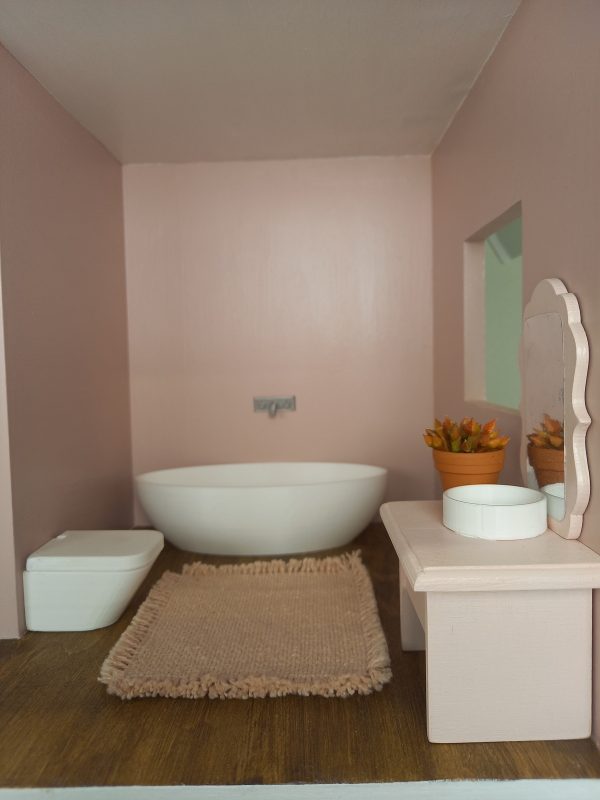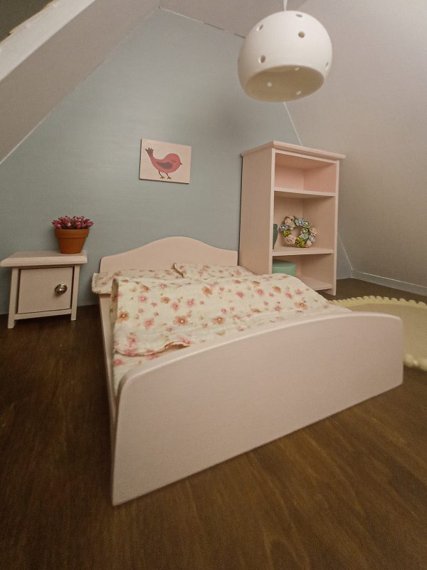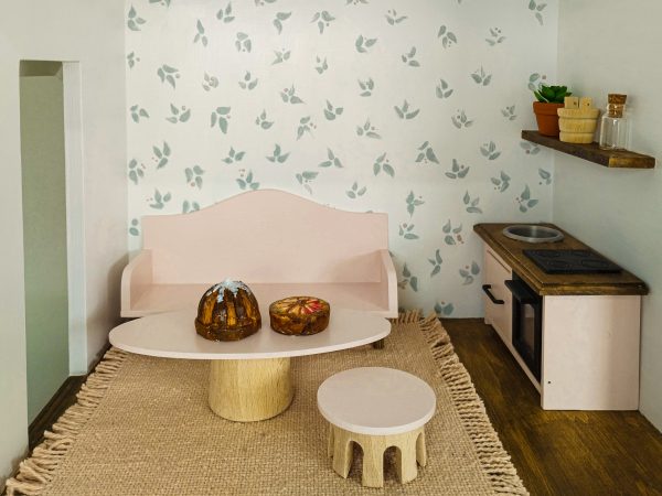 Kellemes pasztell színű, részletgazdag bútorcsomag. 17db-ból álló teljes berendezés 1:12 méretű babaházakhoz.