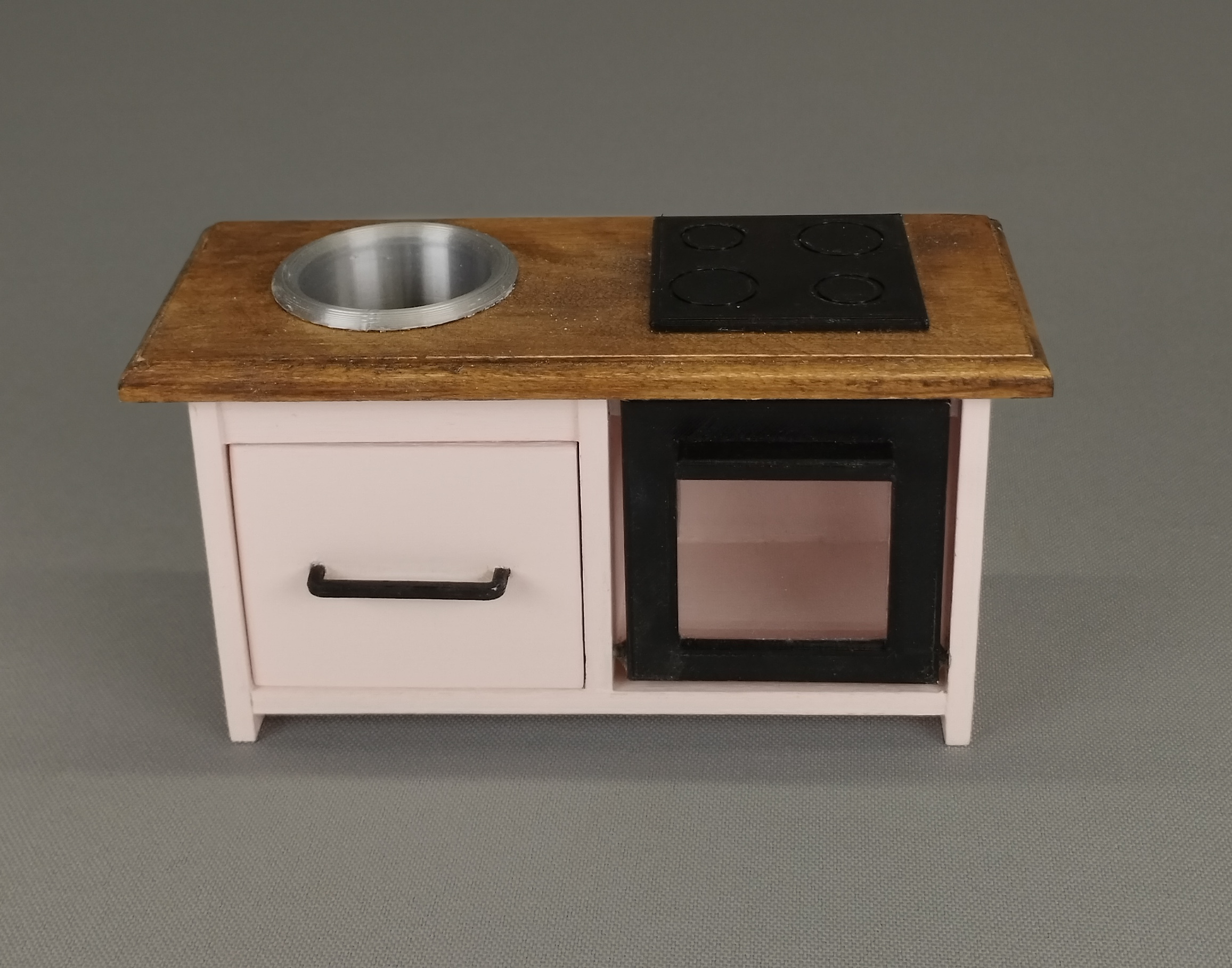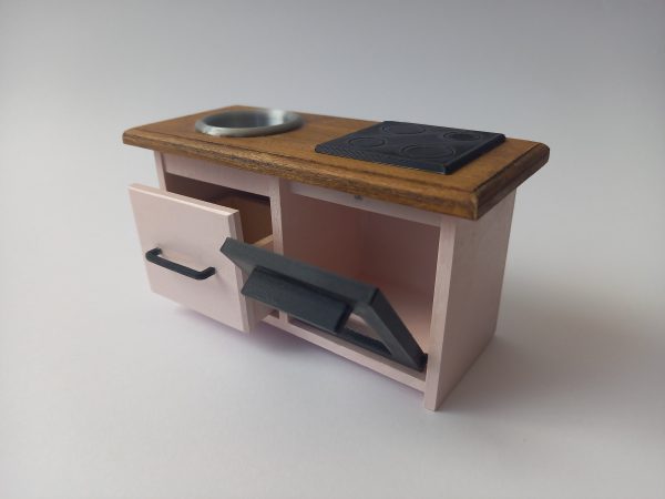 Első ránézésre nem is gondolnánk, hogy ez az apró kis konyhaszekrény mennyi lehetőséget rejt magában. A sütőajtó lenyitható, apró mágneszárral zárható. A fiók fontos dolgok tárolására szolgálhat. Fent pedig egy mosogató és egy főzőlap található, ezzel teremtve lehetőséget egy elmélyült játékra.