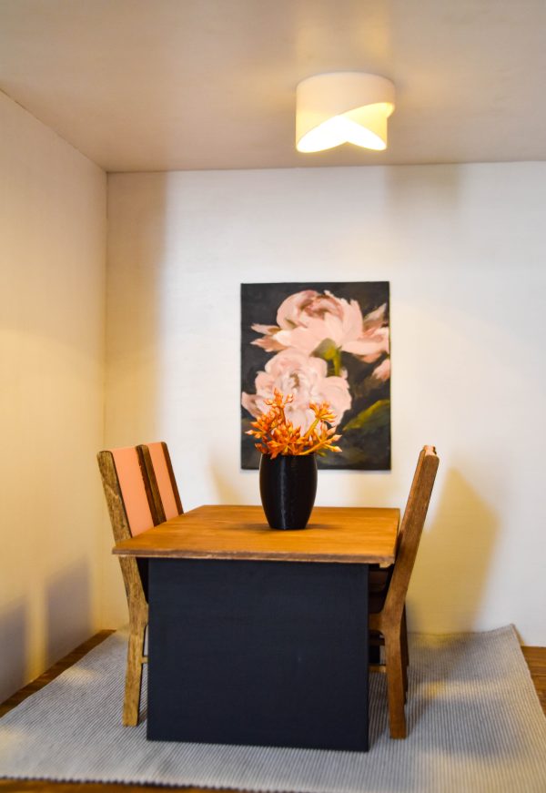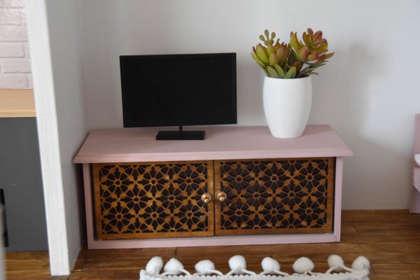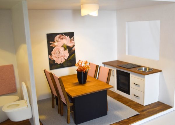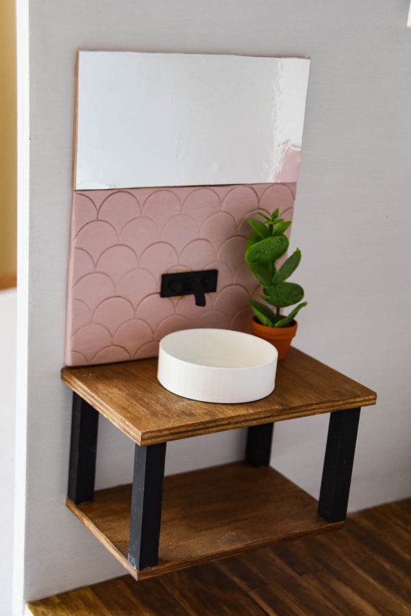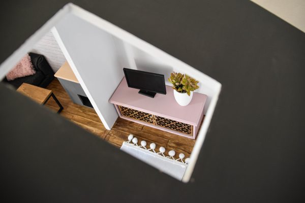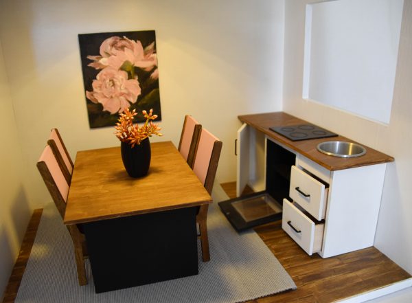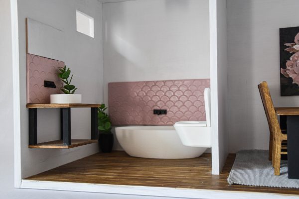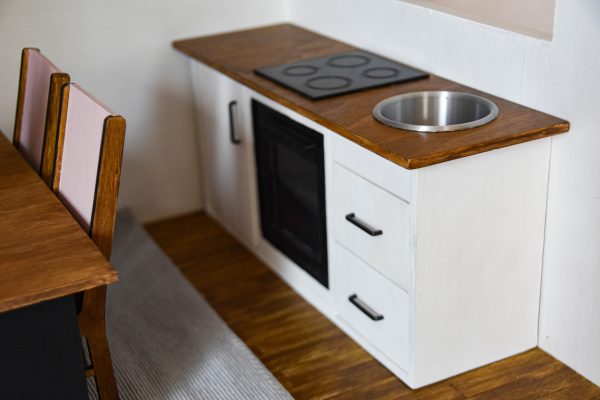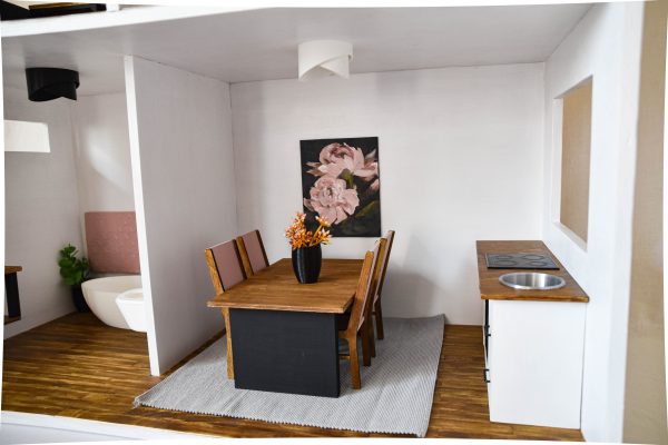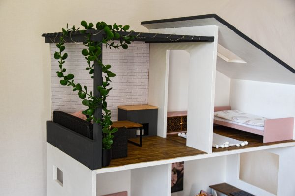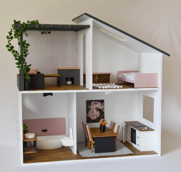 Egy igazán modern babaház a mai trendeknek megfelelően. Mindkét szint parkettázott, kellemes púder színű halpikkelyes mini csempe díszíti a fürdő helyiséget, amiben egy modern kád, egy wc és egy mosdó szekrény is található. Egy kézzel festett kép teszi otthonosabbá az alsó szintet, ahol a konyha és az étkező kapott helyet.  Az emeleti szobába egy ágy és egy virágos ajtós kis szekrény került számos kiegészítővel. Innen egy kijárat nyílik a hangulatos teraszra, ahol a kanapé és az apró kiegészítők mellett egy kis kandalló is helyet kapott, ami egyben a  ház világításához szükséges elemeket és a kapcsolót is rejti. A fürdő elhelyezkedése adott, de természetesen a ház többi része tetszés szerint átrendezhető. A fából készült játékok sokkal időtállóbbak. A babázás pedig nemcsak szórakoztató, hanem készségfejlesztő is!