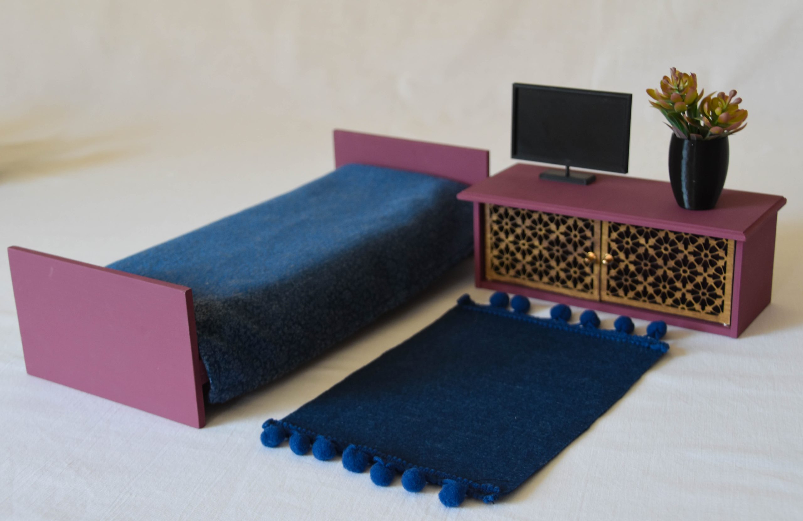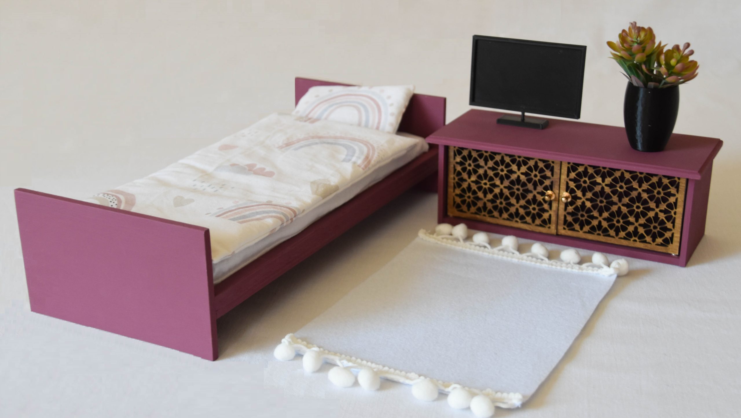 Fehér ablakos díszdobozban egy ágy található matraccal párnával és takaróval, a különleges virágos szekrényünk és hozzá néhány apró kiegészítő (egy TV, egy kaspó virággal és egy szőnyeg), melyekkel egy stílusos  szobát lehet kialakítani, berendezni.